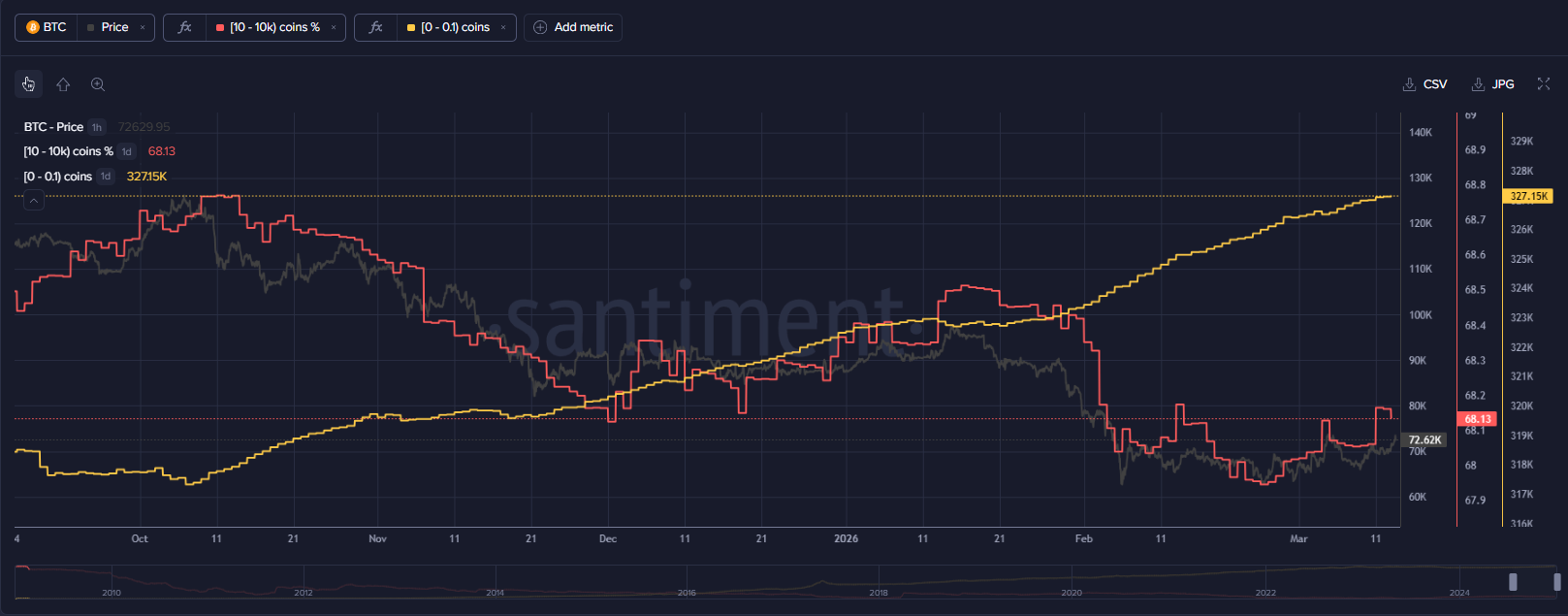 加密分析平台Santiment的数据显示,持有10至10,000枚比特币的大型钱包已开始在71,000美元附近重新积累。